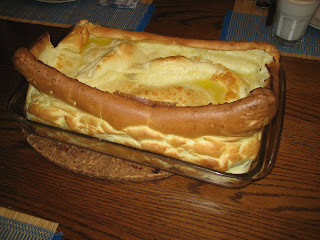Remove pan from oven and pour batter into melted bitter. Return to oven & bake till puffy & well-browned 20 – 25 minutes. Depending on your pan. Dust w/ nutmeg if you like & serve at once w/ any other the following toppings: